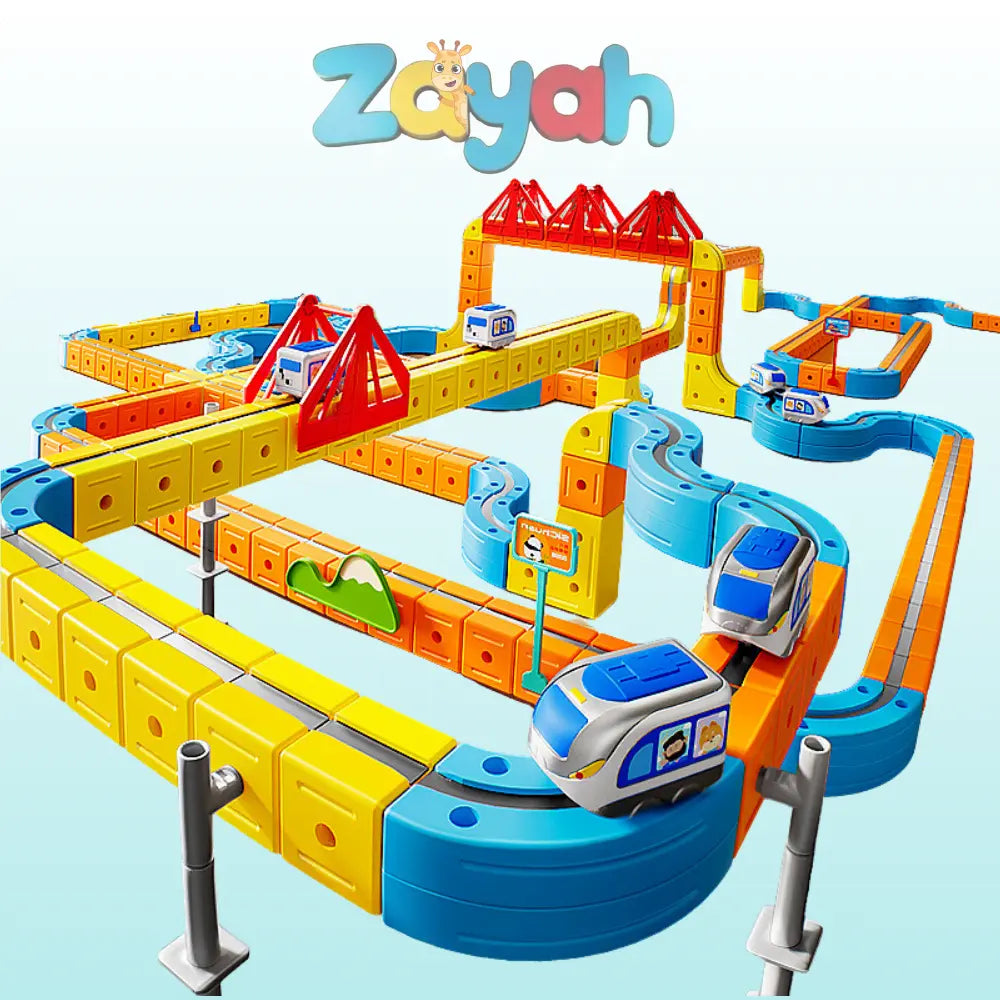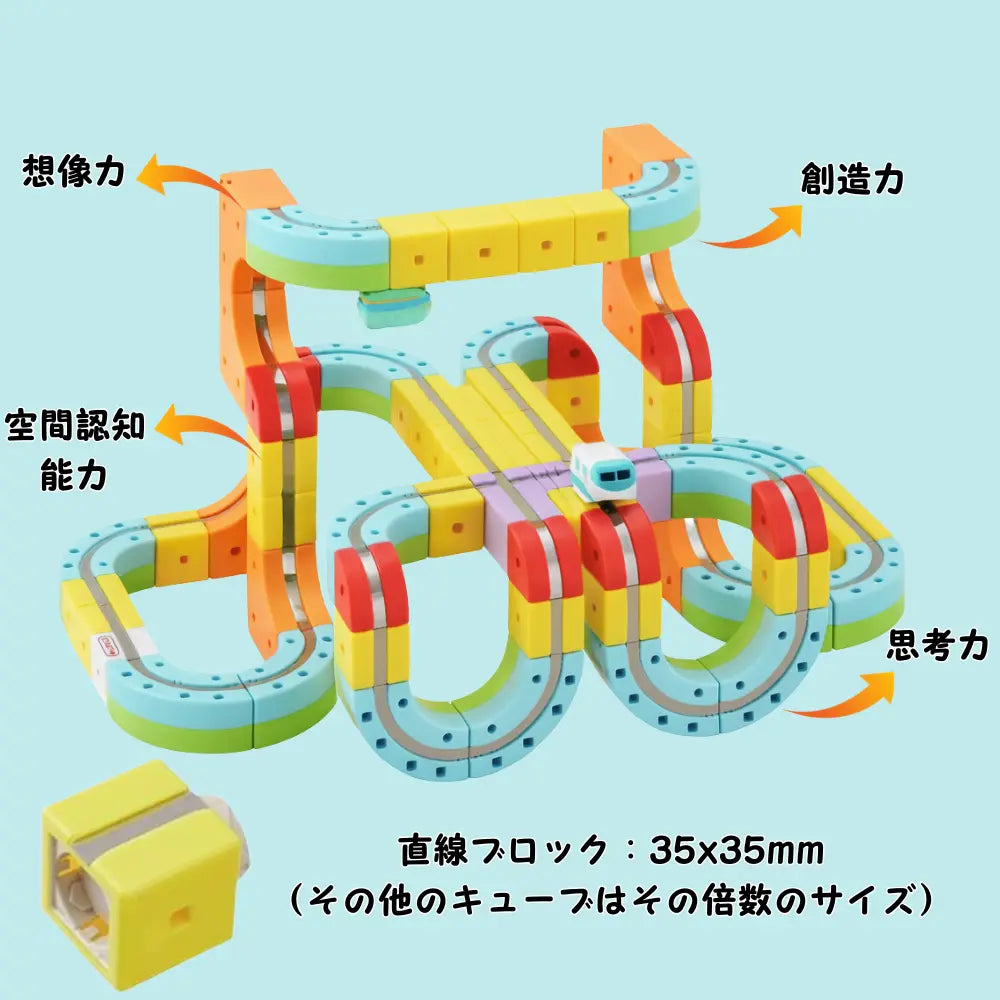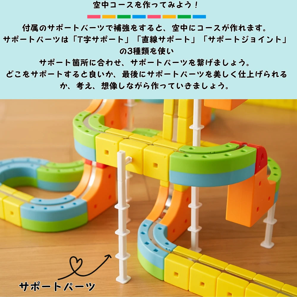 磁力で簡単にコースや立体構造、橋やカーブが作れるインタラクティブなおもちゃです。